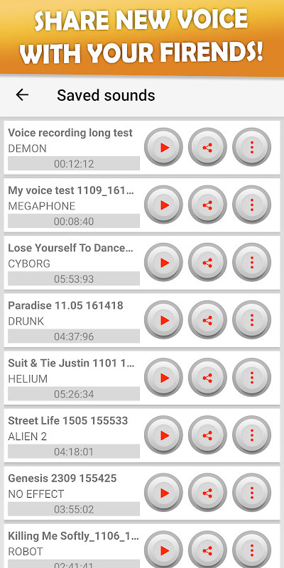 Mit diesem fantastischen Tool können Sie Ihre Stimme auf sehr einfache Weise ändern. Starten Sie die App, drücken Sie die Taste "REC" und sagen Sie etwas, um Ihre Stimme aufzunehmen. Versuchen Sie, fließend und nahe am Mikrofon des eingebauten Telefons zu sprechen (normalerweise an der Unterseite Ihres Telefons). Wählen Sie als Nächstes einen von 10 Soundeffekten aus. Drücken Sie die "Play" -Taste und hören Sie Ihre geänderte Stimme!