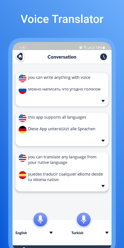 Konversation ist ein Thread-Stil Sprechen und Tippen oder eine Spracheingabe-Funktion, mit der Sie in Ihrer Muttersprache sprechen können, und Sie haben Ihre gewünschte Übersetzung in alle Sprachen mit Speech-to-Text-Sprachübersetzung, die Sie mit der Text-to-Speech-Sprachaussprache anhören und versuchen können, mit jedem zu sprechen . Es unterstützt die Spracheingabe in allen Sprachen.