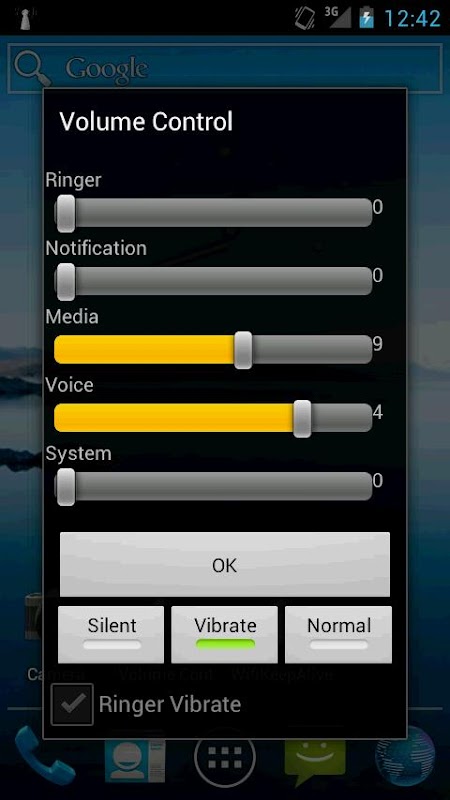This is a volume control application for adjusting Ringer, Notification, Media, Voice, System, and Alarm, also to switch between Silent, Vibrate and Normal. In addition, you can also synchronize the volume level between ringer, notification, and system.