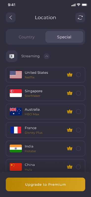 Our servers include a global VPN network including America, Australia Europe, and Asia, and expand to more countries soon. Most servers are free to use, you can click the flag and change server as many times as you want.