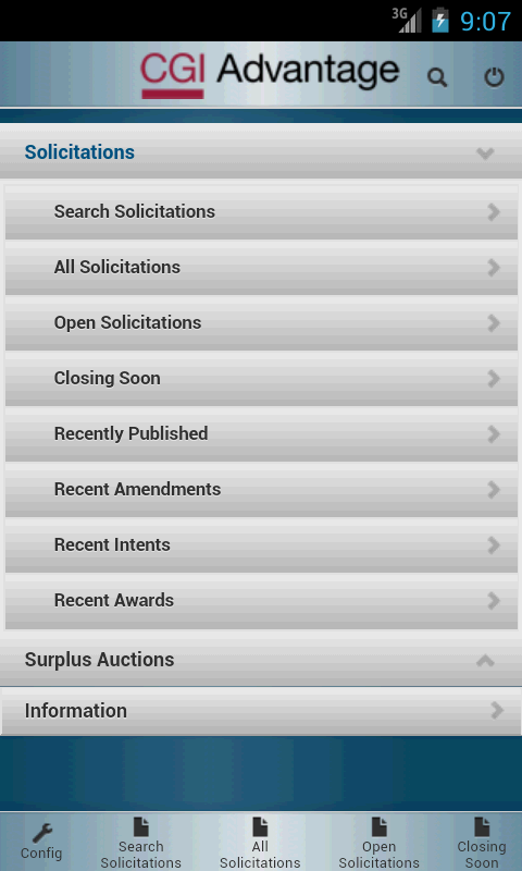 The CGI Advantage VSS (Vendor Self Service) Business Opportunities app allows you to browse business opportunities (solicitations such as RFPs, RFIs, etc.) and surplus auctions offered by state and local governments through their CGI Advantage Vendor Self Service (VSS) vendor portals. The app allows public viewing of these business opportunities as well as access for vendors registered with the particular state or local government entity. You may use this app to connect to multiple CGI Advantage Vendor Self Service portals. For example, if you are doing business with multiple state or local governments each providing their own CGI Advantage Vendor Self Service portal, each portal can be independently configured in the app and you may switch between different Vendor Self Service portals to review the opportunities available from each government. Registered users will have access to their "Watchlist" features normally available through the CGI Advantage Vendor Self Service desktop browser portal.