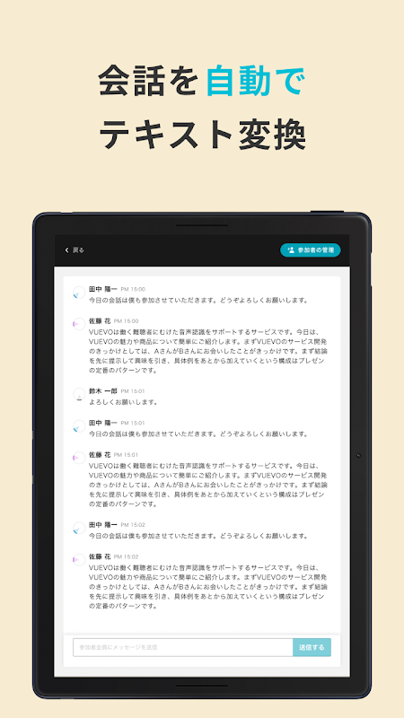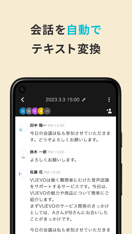 Dies ist eine App, die eine reibungslose Kommunikation zwischen hörgeschädigten und hörgeschädigten Menschen unterstützt, indem sie mit einem dedizierten Mikrofon verknüpft wird, um den Inhalt von Gesprächen und Besprechungen in Echtzeit zu visualisieren.