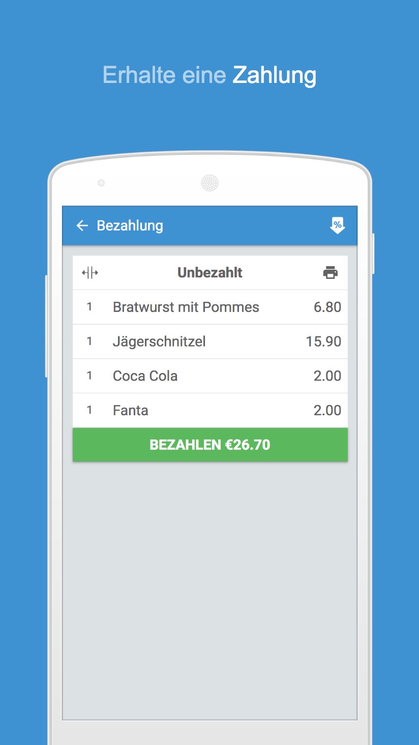 Waiterio ist ein voll funktionsfähiges Kassensystem. Berechne den Gesamtbetrag für eine Bestellung und erhalte die Zahlungen in bar oder per Karte.