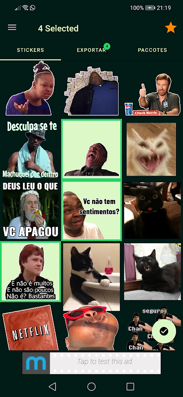 Muitos stickers de memes para exportar para o whatsapp escolha uma a uma e envie para o whatsapp, depois, dentro do WhatsApp basta ir ao grupo ou conversa e envia-los.