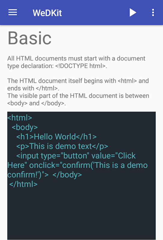 Web Development Kit will help you to learn HTML and CSS by using your mobile phone. Here you will get code snippet with short description. The most interesting part is you can edit those code and run to view the output.
