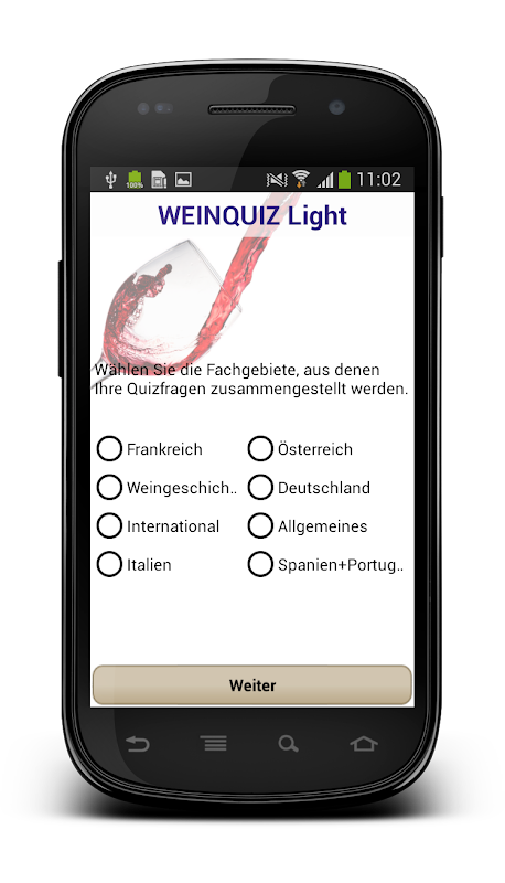 Diese kostenlose Version des WEINQUIZ ist ein repräsentativer Auszug der Applikation DAS WEINQUIZ und bietet 101 Quizfragen aus 8 verschiedenen Fachgebieten in einer bunten Mischung.