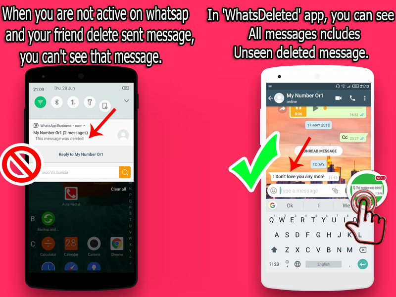 With new WhatsDeleted app you can Detect and save deleted messages and WhatsApp files.