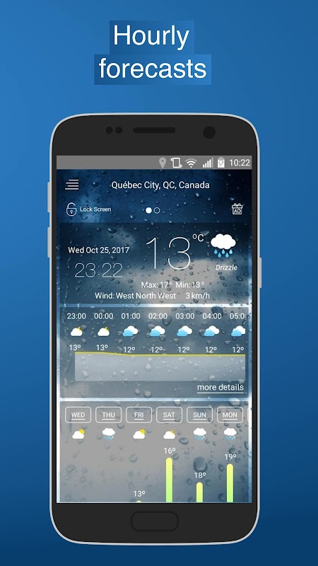 Mit weather live können Sie die detaillierte Wettervorhersage für 14 Tage abrufen, wo immer Sie sind, zu jeder Tageszeit oder für die folgenden Tage, indem Sie einfach auf die Symbole drücken.
