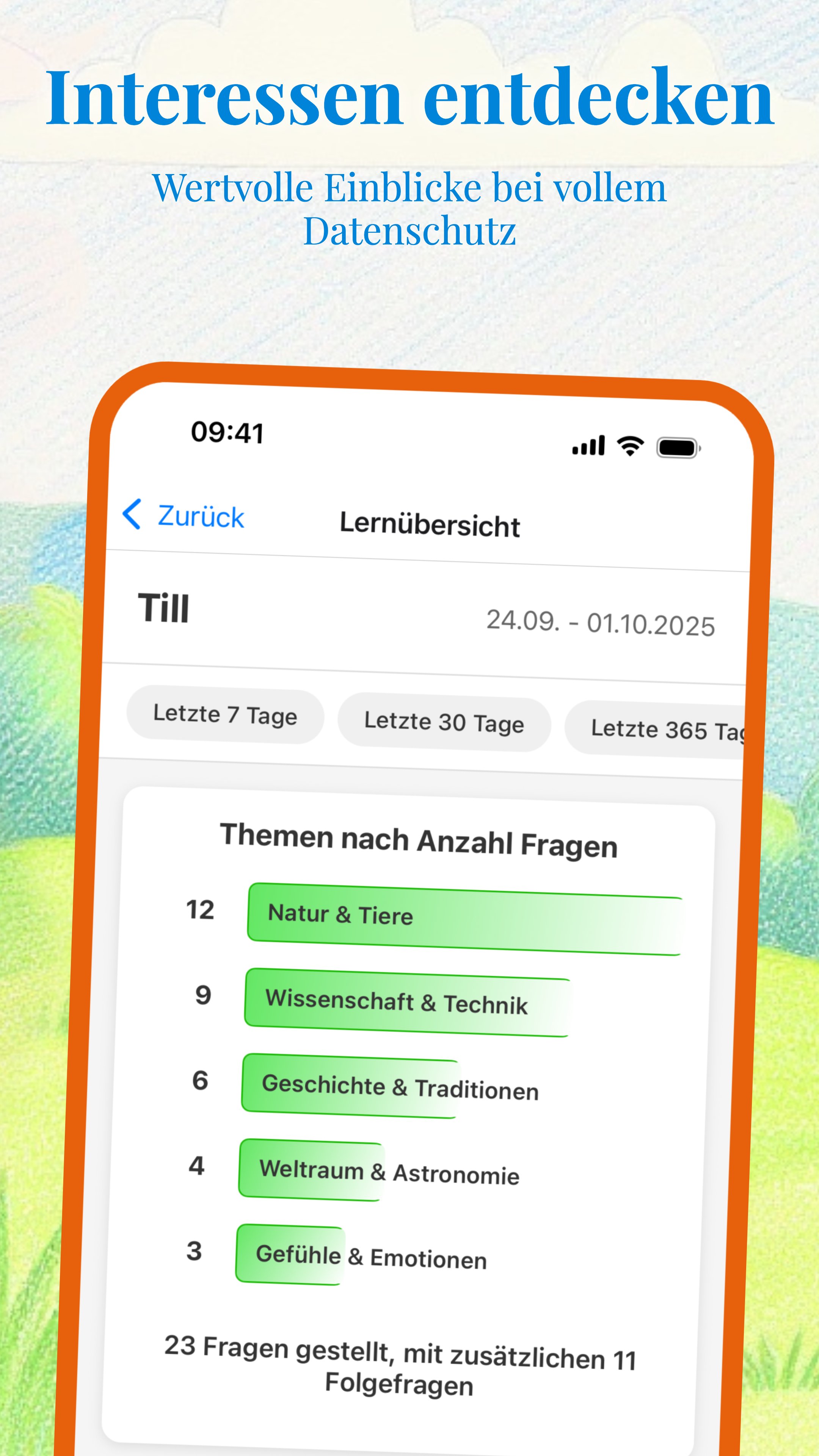 Sie können bis zu fünf Kinderprofile anlegen und für jedes Kind individuelle Einstellungen vornehmen. Die App zeigt Ihnen, welche Themen Ihre Kinder besonders interessieren – ohne dabei die Gespräche selbst zu sehen. Sie bekommen wertvolle Einblicke und Gesprächsanlässe, während die Privatsphäre Ihrer Kinder geschützt bleibt. Das entlastet Sie bei den vielen "Warum?"-Fragen des Alltags und gibt Ihnen gleichzeitig die Gewissheit, dass Ihre Kinder sicher mit KI interagieren.