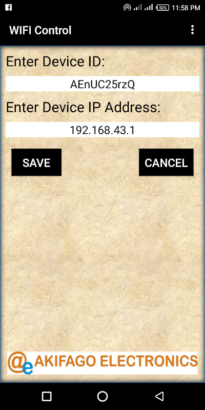 This mobile application was developed to assist electronic engineering students perform basic Wi-Fi control projects using the esp8266 Wi-Fi module and Arduino Uno Board. It controls using the internet and without internet connection. Control using the internet option works with Akifago Wi-Fi Automation Board only. While control without the internet requires the user save the IP address of the programmed Wi-Fi module displayed on the arduino IDE serial monitor. The below sketch code must be followed for proper use of these mobile application.