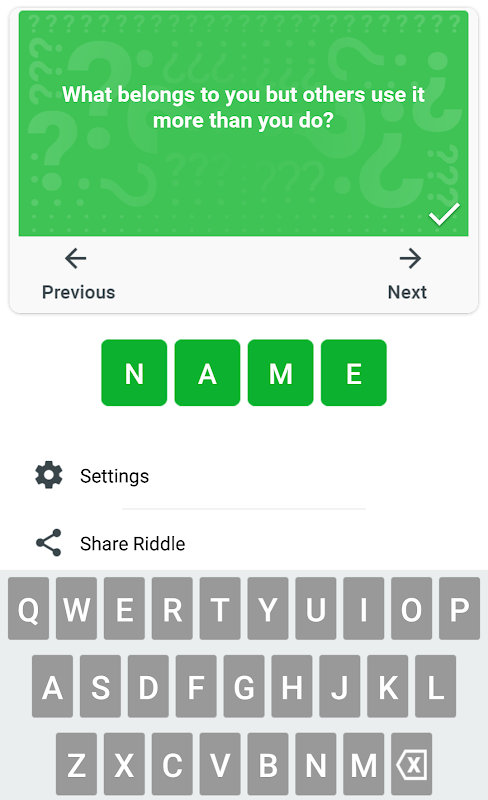 Was ist ein Rätsel? Es ist eine Frage mit einer schnellen witzigen Antwort. Egal, ob Sie Rätsel für Schulkinder oder Rätsel und Antworten für Kinder benötigen, hier erhalten Sie alles. Darüber hinaus zeigt Ihnen das Widget immer Ihr Rätsel des Tages und lässt Sie Ihre Logik trainieren und gleichzeitig Spaß haben. Was ist die Antwort auf dieses Rätsel? Klicken Sie auf den Hinweis und Sie erhalten die Hilfe. Harte Rätsel, einfache Rätsel, kurze Rätsel, alle Rätsel in einer App. Denksportspiele sind die beste Methode in diesem Widget - Rätsel, Witze und Denksportaufgaben. Lustige Denkaufgaben mit Antworten sind der beste Weg, um zu studieren und sich nicht zu langweilen. Holen Sie sich Ihre Gedanken-Puzzle-Spiele mit harten Denkaufgaben und Spaß für das Gehirn.