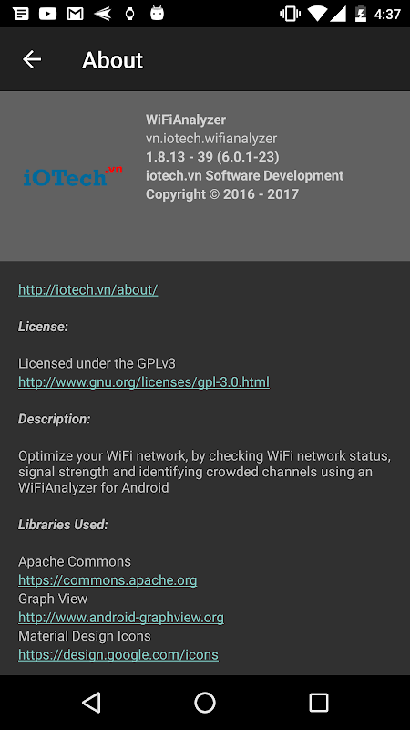 Users' privacy and security is a huge concern these days and WiFi Analyzer is designed to use as few permissions as possible. It asks for just enough to perform the analysis. Plus, it is all open source so nothing is hidden! Most notably, this application does not require access to internet, so you can be sure it does not send any personal/device information to any other source and it does not receive any information from other sources.