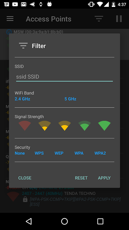 - Available filters: WiFi band, Signal strength, Security and SSID