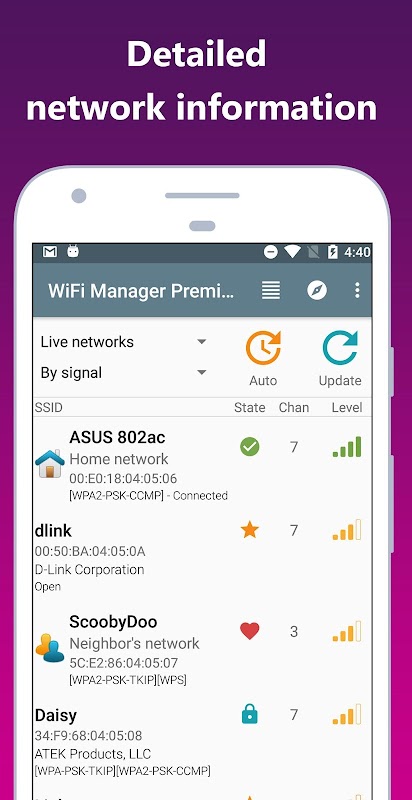 Suchen, verbinden, verwalten Sie WiFi-Netzwerke. Verbessern Sie die Verbindungsqualität mit einem Kanalradar. Entdecken Sie offene Netzwerke in Ihrer Nähe. Stellen Sie die App so ein, dass sie nach dem besten Netzwerk sucht und zu diesem wechselt.