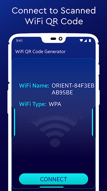 Mit dem ansprechenden und futuristischen Design des WiFi QR Code Readers können Sie sich einfach mit einem WiFi-Netzwerk verbinden, indem Sie einen vorgenerierten QR-Code scannen. Setzen Sie einfach Ihre mobile Kamera auf den QR-Code und die App verbindet sich automatisch mit dem gescannten Netzwerk.