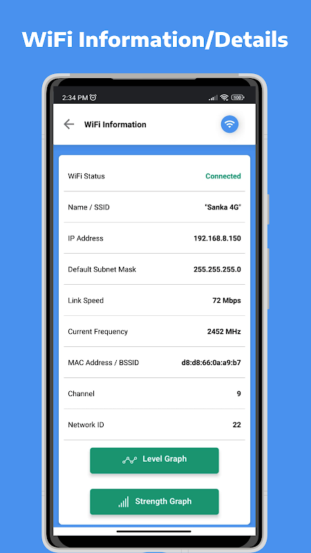 ✅ Umfassende Informationen zum WLAN-Netzwerk – Greifen Sie auf detaillierte Daten zu, einschließlich Signalstärke, Verbindungsgeschwindigkeit und Sicherheitstyp.