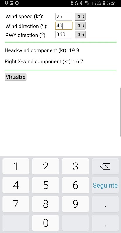 The mobile application allows you to practice the calculation of the head/tail-wind and the cross-wind components relative to the bearing of a runway (QFU) or track.
