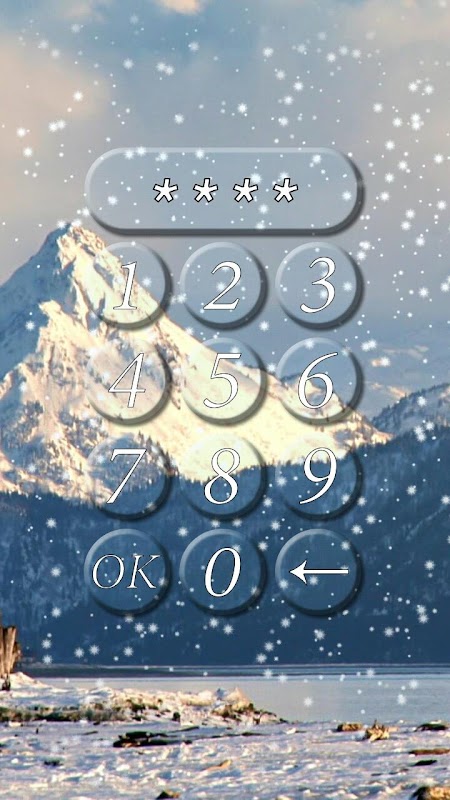 Winter and snowfall lock screen with effects generated in the Open Gl. Winter lock screen is a fun and free application for entertainment purposes. You can use the application to lock your phone screen. Winter lock screen is very easy to use. You can choose from a zip lock or PIN. Inside of the application you will find beautiful backgrounds with winter landscapes.