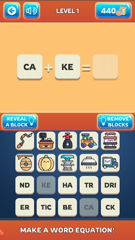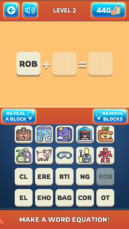 In jedem Level müssen Sie das richtige Wort aus einigen Wortteilen und das richtige Bild aus einigen Bildern erraten und eine Wortgleichung erstellen!