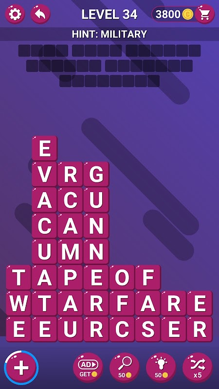 The Word Stacks level has stacks of tiles shuffled in an intelligent way. Player can swipe across the tiles of letters horizontally or vertically to form a word. Once the correct word is found, the tiles concerning the word are removed and tiles above are drop to form/continue the tower of word. There are many categories and each level are of a random group/category of word. Obviously, a hint for each level’s category is provided and displayed to help the player.