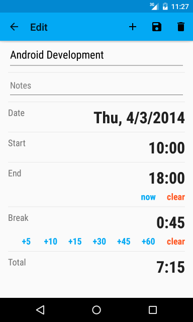 Geben Sie einfach Start, Ende und eine kurze Beschreibung ein und die App zeigt Ihnen, wie viele Stunden Sie an diesem Tag gearbeitet haben.
