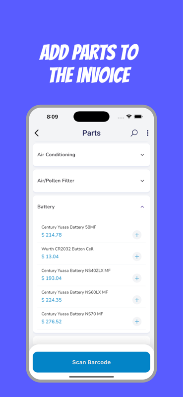 Barcode-Scannen für die Rechnungsstellung: Mechaniker können während der Arbeit Produkt-Barcodes direkt in Rechnungen scannen und so sicherstellen, dass alle Teile und Dienstleistungen korrekt abgerechnet werden.
