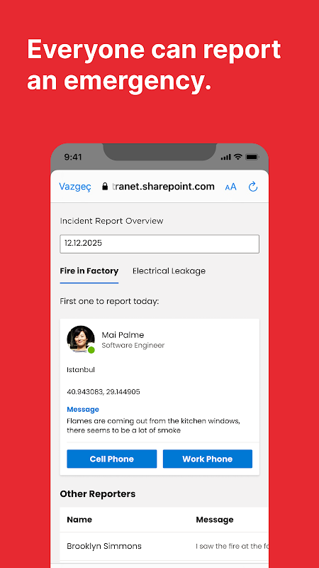 Mit der Notfall-App; Notfälle können durch Push-Benachrichtigungen effektiv angekündigt und aktualisiert werden, sodass eine unterbrechungsfreie Kommunikation gewährleistet ist. Mitarbeiter antworten mit Sicherheitsstatus und Standort, die den Administratoren in Echtzeit mitgeteilt werden. Außerdem dauert das Versenden von Nachrichten an Notfallkontakte oder die Kontaktaufnahme mit Notrufnummern weniger als eine Minute.