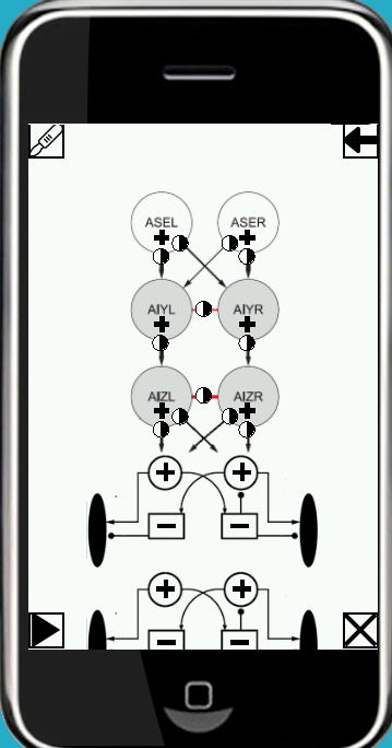 C. elegans is a little worm with a simple nervous system that allows it to find food (and do other useful activities) as it wriggles around in wet soil. The WormWorx app simulates the worm’s locomotion system and the part of its nervous system that senses the food that it likes (bacteria) by the “scent” of dissolved salt that comes from the bacteria. The worm follows the scent to the food.