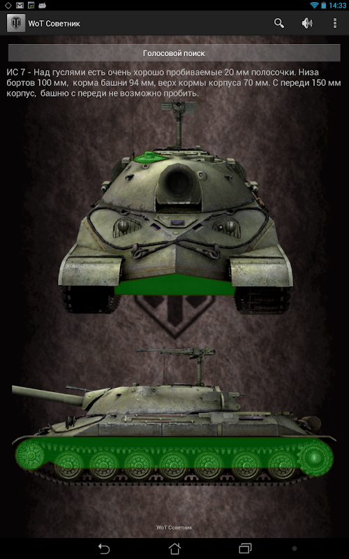 Подходит тем, кого интересуют танки с 8 по 10 уровни, а так-же 20 танков 4-7 уровня. Вы можете воспользоваться текстовым или голосовым поиском, чтобы получить описание наиболее пробиваемых частей выбранного вами танка, в том числе озвученный вариант (голосовое описание можно отключить)