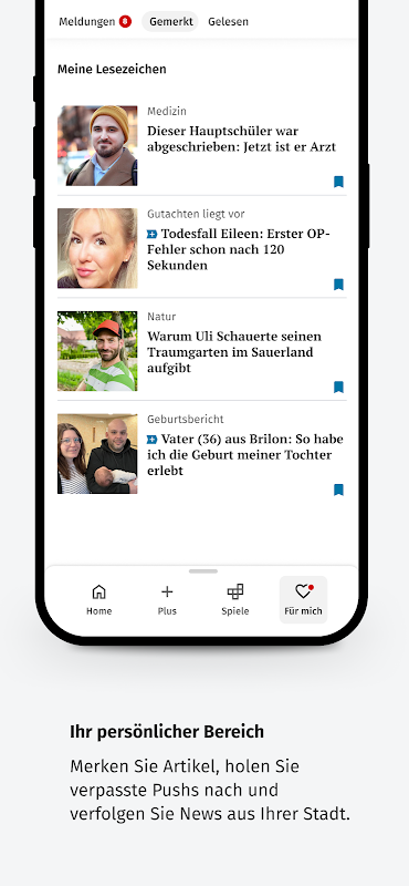 Im personalisierten Bereich „Für Mich“ finden Sie Ihre verpassten Push-Meldungen sowie gemerkte und gelesene Artikel – übersichtlich an einem Ort gebündelt.