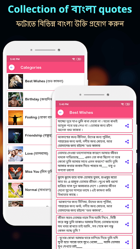 Bangla-Text auf Foto schreiben bietet die Möglichkeit, Bangla-Liebesgedichte, Bangla-Gedichte, Bangla-Gazals und Bangla-Shayari auf Fotos zu schreiben, indem Bangla die Foto-App eingibt. Außerdem können Sie die besten Zitate aus verschiedenen Kategorien von Zitaten wie Freunden auswählen Zitate, Einstellungszitate, inspirierende Zitate, Liebeszitate usw. in Bangla-Sprache und auf Ihrem Foto eingestellt.