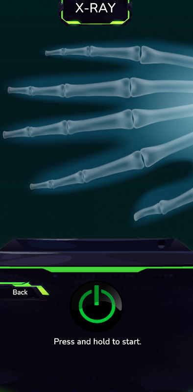 Die App verfügt über eine realistische Röntgenscanner-Animation, die Sie durch Drücken der Röntgenscanner-Taste auf dem Bildschirm aktivieren können. Sie können das Röntgenbild auch nach links oder rechts verschieben, indem Sie Ihren Daumen auf dem Bildschirm bewegen, um der Simulation ein zusätzliches Maß an Realismus zu verleihen.