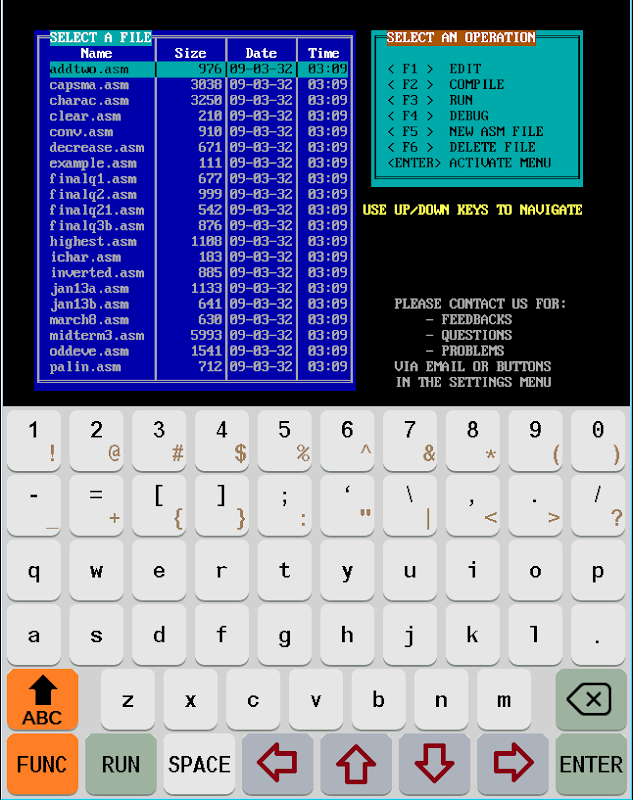 In case of preference, an assembly can be written with the aid of an internal editor. It can be compiled with the built-in assemblers (MASM, TASM) and can be debugged with the debugger application. For such use, the user must be familiar with the MSDOS environment.