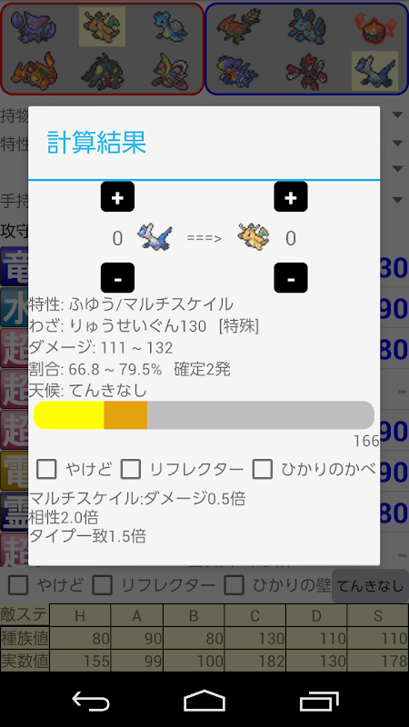 相手の型もリストから選ぶだけで簡単に開いてのステータスを計算し、表示します。