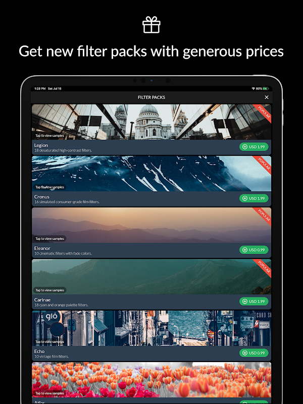 - Bieten Sie mehr Filter durch In-App-Käufe zu einem erschwinglichen und großzügigen Preis.