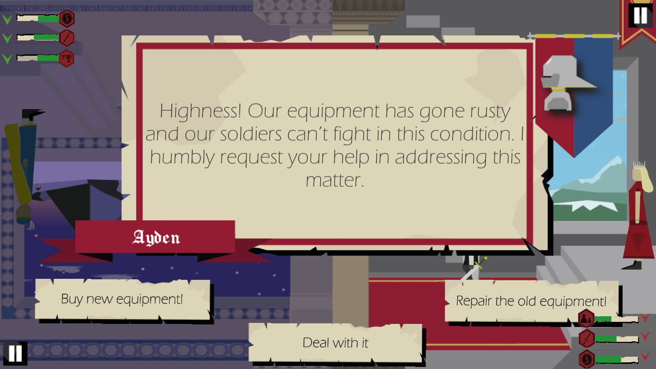 Your Highness! is a 2 player local multiplayer strategy game where you and your friend are each in control of a country and have to make choices in order to keep your kingdom in good order and destroy the other's kingdom!