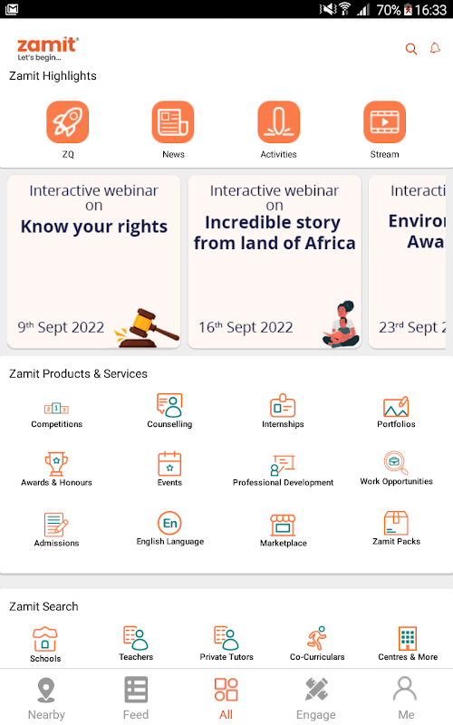 Die App bietet Auflistung und Suche von Schulen, Bildungsnachrichten, Veranstaltungen und Aktualisierungen, Podcasts und Videos mit Vorträgen namhafter Experten aus verschiedenen Bereichen, engagierte Aktivitäten, Geschichten für Kinder, Ressourcen für Lehrer, Wachstumschancen für Lehrer, Edutainment und ein zentrales Zulassungssystem (zamit). ZCAS), Live-Streaming von Schulveranstaltungen und mehr.