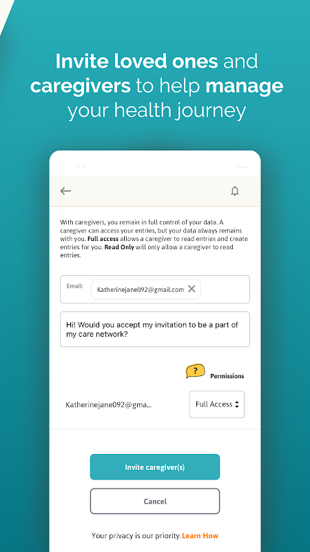 - Laden Sie auf sichere Weise einen Freund oder ein Familienmitglied ein, Ihr Betreuer zu sein und Ihnen bei der Verwaltung und Anzeige Ihrer Gesundheitsinformationen zu helfen