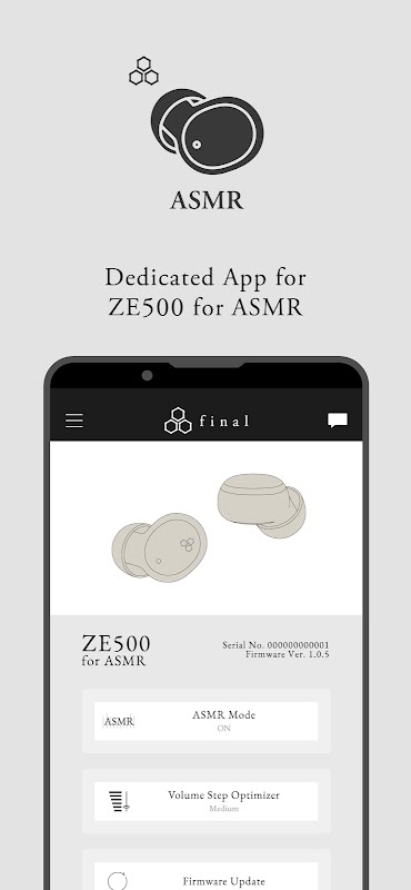 Diese spezielle mobile Anwendung wurde von der renommierten Audiomarke Final Audio entwickelt und ist speziell für die kabellosen Kopfhörer „ZE500 für ASMR“ von Final Audio konzipiert. Es ermöglicht Benutzern, ihr einzigartiges Audioerlebnis individuell anzupassen und so maximalen Komfort und Genuss zu gewährleisten.
