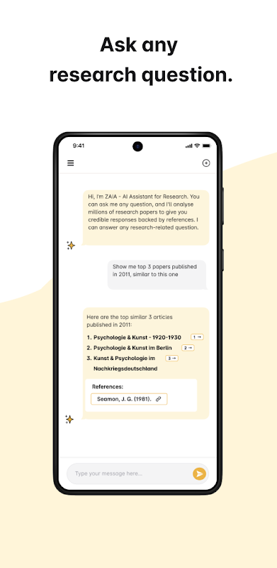 Nahtlose Integration: Integrieren Sie ZAIA problemlos in Ihren Forschungsprozess. Stellen Sie einfach Ihre Fragen, und ZAIA liefert Ihnen schnelle, umsetzbare Antworten. Gleichzeitig hilft es Ihnen, Forschungsartikel und -papiere zu finden, die Ihre Ergebnisse stützen.