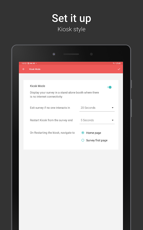 Stellen Sie das Tablet mit Ihrer geladenen Umfrage ein und konfigurieren Sie es so, dass es jedes Mal neu geladen wird, wenn eine Antwort gesammelt wird. Sobald eine Antwort gesammelt wurde, ist sie bereit für die nächste.
