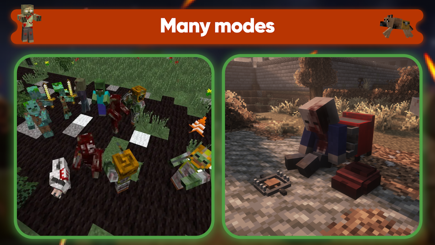Diese Art von Zombies-Herausforderung 👀 ist nicht nur eine unterhaltsame Zombie-Apokalypse-Mincraft-Mod-Animation, in der Mobs chaotisch umherlaufen, es ist ein Spiel und eine Grundgesteinswelt 🌏, in der jeder Mob für uns tödlich ist, und wenn ganze Horden 👾 tödlich sind Sie verfolgen uns – der Kampf wird nicht eine Nacht dauern ✨... Unsere Mojang-Freunde werden für uns wertvoller sein als jede Waffe ⚔️, denn ihre Hilfe ist es wichtiger in True Survival Zombie Apocalypse Mods. ✅