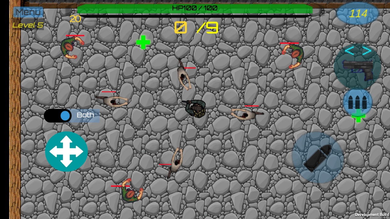 Viele Levels mit intelligenten KI-Zombies und 3 verschiedenen Waffen, einer Handfeuerwaffe, einem Gewehr und einer Schrotflinte.