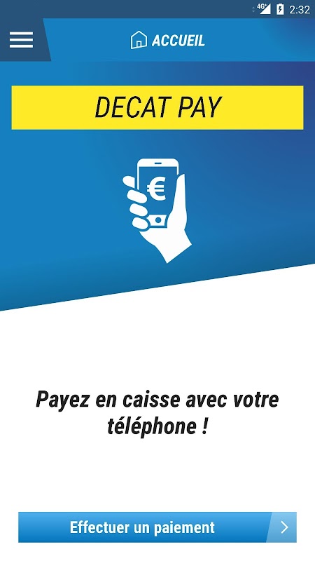 L'appli DECAT PAY est liée au logiciel d'encaissement. Lors de vos achats, nous vous demanderons de scanner votre carte fidélité disponible dans l'application. Vous recevrez alors votre total à payer. Il ne vous restera plus qu'à accepter en appuyant sur "Payer".