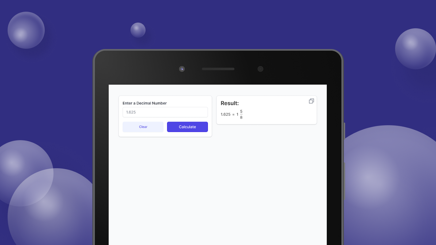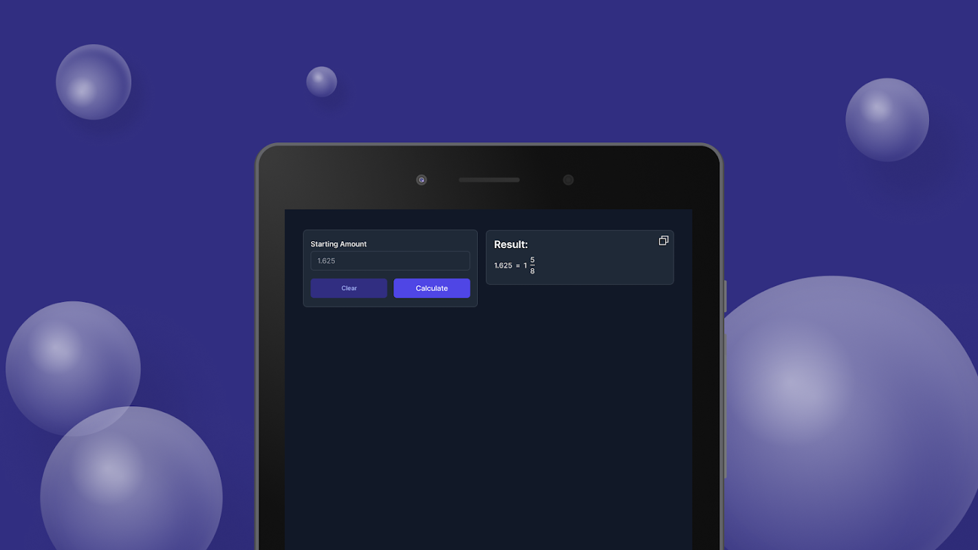 Welcome to the Decimal to Fraction Calculator, your ultimate tool to simplify and streamline number conversions. Whether you're a student, teacher, engineer, or just someone who loves math, this is the perfect app for seamless decimal-to-fraction transformations and more.