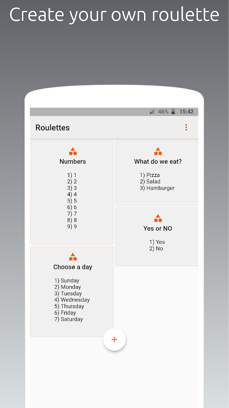 Sometimes it is necessary to make random decisions, I know when you are with your friends and do not agree what to do, what to eat or where to go. We present this application where you can create a roulette, add your options and finally spin the decision roulette.