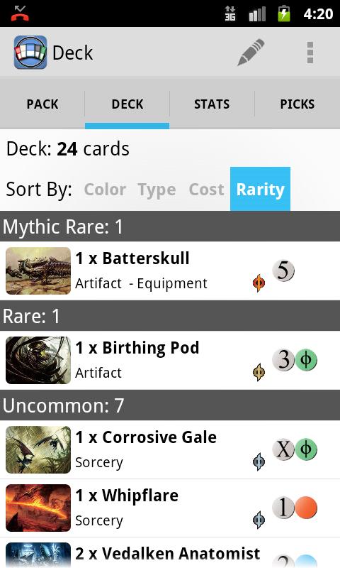 After the draft is finished, build your deck using the simple interface, swapping cards around with a simple touch. Once the deck is built, test it in the draw simulator, email the list to your friends, or print out the decklist and assemble the deck with your own collection! Or access the handy card ratings and strategy tips at any time, making Decked Drafter the perfect pocket guide for your next draft event.