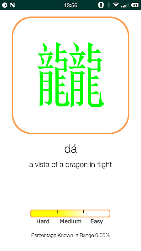 Recommended study habits: select a range from 50 to 70 characters and begin memorizing them with the tone colors on and in sequential order. This may be difficult at first but after rapid repetition your brain will start recognizing them. You should also notice certain parts of characters will be found on other characters and in many cases this will give a clue as to the pronunciation. You will begin learning faster as your brain begins to recognize patterns in the language. After becoming comfortable with the range start marking them as “easy” or “medium”, or “hard” (they should all already be marked hard the first time around). Then turn on random mode and that should help you finish memorizing the characters that were giving you problems. Once you have a really good grasp on the range try turning off the tone colors and see how well you can also recall the tones. Having successfully mastered a range, move on to the next one. I feel it is important to add that even though you may be able to recall a given range very well it is still beneficial to study it periodically as repetition will strengthen your recollection.