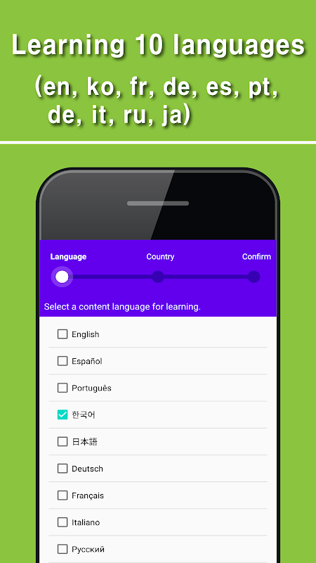 -. Study language: English, Spanish, Portuguese, Korean, Japanese, German, French, Italian, Russian