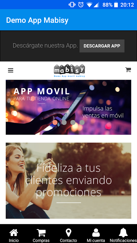 Con esta aplicación podrás ver un ejemplo de una aplicación de móvil para una tienda online de Mabisy. Con esta aplicación podrás enviar notificaciones a tus clientes, con ofertas y promociones, nuevos productos, etc..